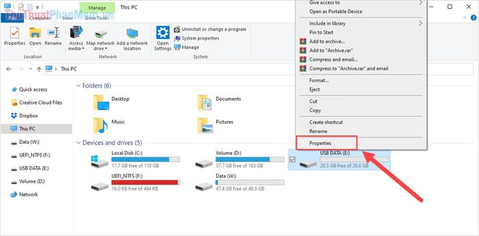 Bước 3: Sau khi USB đã được Format xong, Click chuột phải vào USB và chọn Properties.