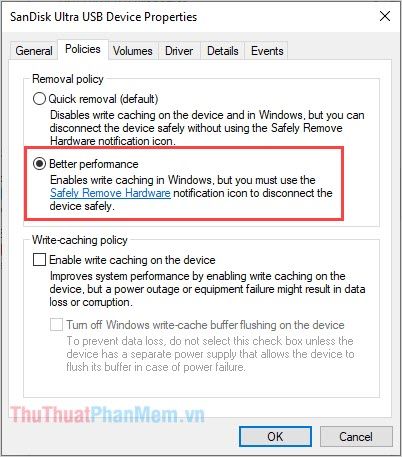 Mặc định, cài đặt USB của bạn thường chỉ ở chế độ Quick Remove - chế độ bình thường, không có hiệu suất cao. Để kích hoạt tính năng hiệu suất cao, thực hiện như sau: