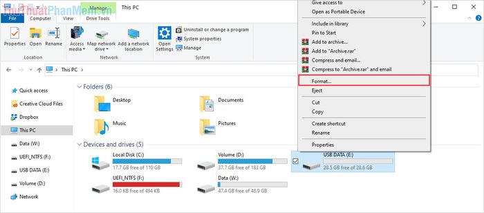 Bước 1: Đầu tiên, mở This PC và Click chuột phải vào USB để chọn Format…