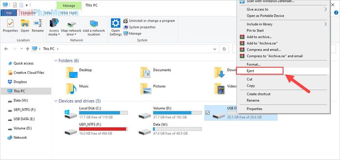 Tuy nhiên, khi kích hoạt tính năng này, bạn phải tháo USB đúng cách. Điều này có nghĩa là trước khi rút USB, bạn phải Click chuột phải và chọn Eject trước đó.