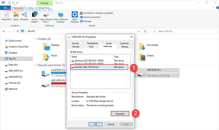 Bước 4: Tìm kiếm tên của USB và chọn Properties để mở cài đặt.