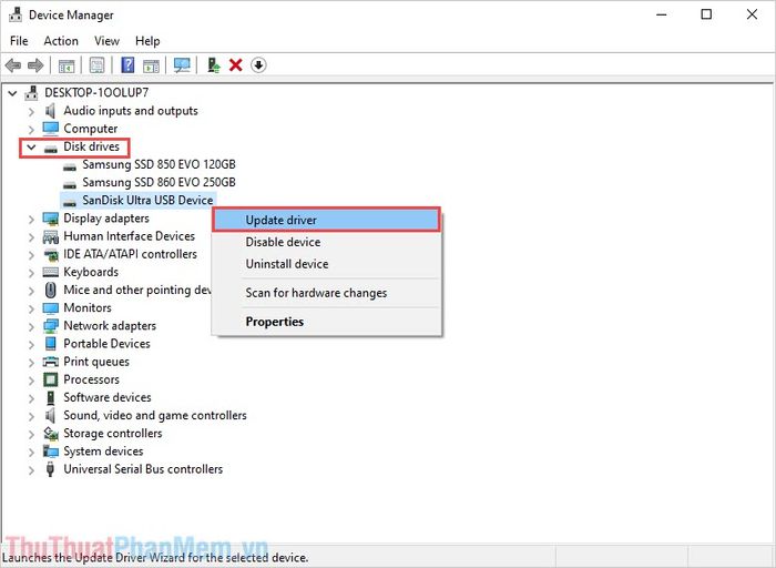 Bước 2: Tiếp theo, mở mục Disk Drives để xem danh sách thiết bị lưu trữ kết nối với máy tính. Tìm tên của USB và Click chuột phải để chọn Cập nhật Driver.