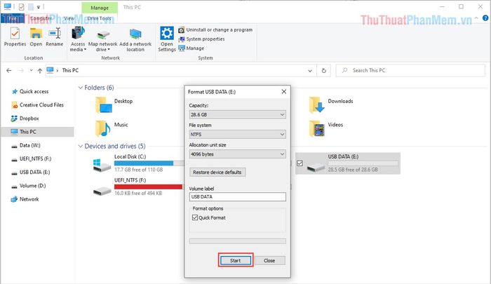 Bước 2: Trong cửa sổ Format, thiết lập các thông số như hình dưới và nhấn Start để bắt đầu.