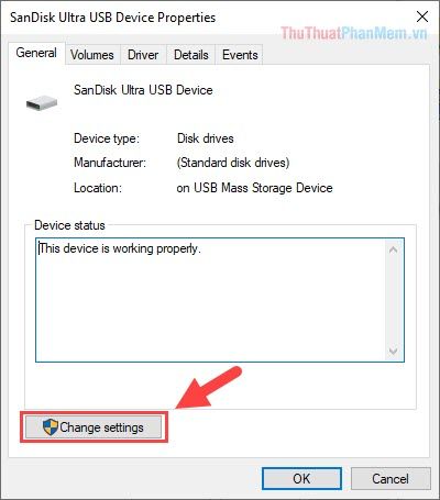 Bước 5: Trong cửa sổ Properties của USB xuất hiện, chọn Change Settings để điều chỉnh cài đặt bên trong.