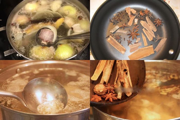 Bước 4: Khi nước lèo đã sôi, vớt hành tây và gừng ra, thêm hoa hồi, thảo quả... vào nấu trong khoảng 5 phút. Sau đó, dùng rây vớt các nguyên liệu này ra. Lưu ý rằng thời gian bỏ càng lâu, phần nước lèo sẽ giảm nhanh chóng.