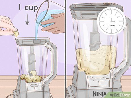Xay tỏi trong máy xay sinh tố. Đưa tỏi vào máy xay. Thêm 1 cốc (240 ml) nước và đậy nắp. Xay đến khi tỏi nhuyễn (khoảng 1 phút).