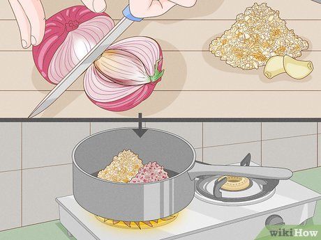 Băm tỏi và hành. Sử dụng dao hoặc dụng cụ ép tỏi để nghiền tỏi. Hành được cắt nhỏ lên thớt bằng dao sắc. Sau đó, cho hành và tỏi vào xoong lớn.