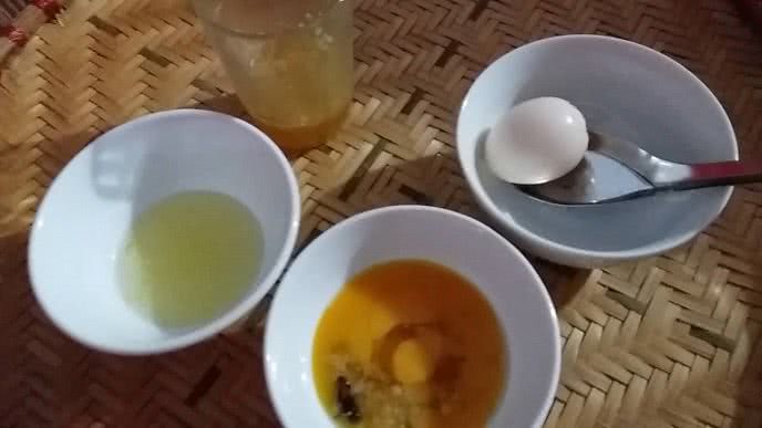 Chị em lấy lòng đỏ trứng gà (bỏ lòng trắng). Sau đó, từ từ đổ mật ong lên lòng đỏ trứng gà sao cho mật ong phủ đều bề mặt lòng đỏ. Nếu là mật thật, lòng đỏ sẽ thay đổi màu và chín dần. Để trong 6 - 8 giờ, lòng đỏ trứng sẽ được mật ong “chế biến” (lòng đỏ cô đặc và mất màu đỏ hồng như trứng sống).