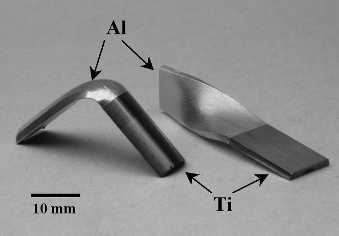 - Có thể nối kết hai vật liệu có đặc tính vật lý và nhiệt học khác nhau, điều mà các quy trình gia công khác không thể thực hiện, chỉ có thể đạt được thông qua phương pháp khuếch tán. Ở hình dưới, thử nghiệm uốn xoắn của một tấm kim loại nối giữa nhôm 6082 (dòng nhôm 6) và titan ELI (Ti-6Al-4V, hay còn gọi là titan Gr5) không cho thấy bất kỳ lỗi nào xảy ra tại vùng nối. Mác nhôm và mac titan ở phía trên cũng là vật liệu mà Apple thường sử dụng cho các sản phẩm của mình.