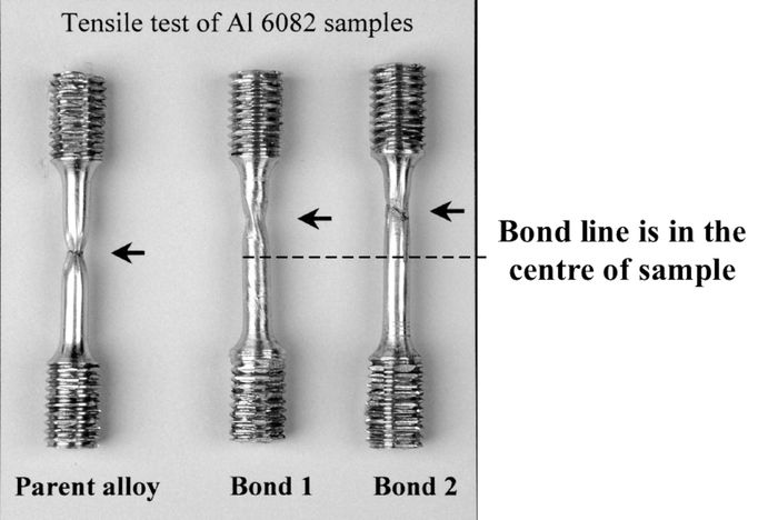 - Nếu kiểm soát tốt, mối liên kết sẽ mang lại độ bền tương đương với vật liệu gốc. Như thể hiện trong hình dưới đây, hai mẫu nhôm được nối với nhau bằng phương pháp khuếch tán thể rắn tại điểm trung tâm. Khi bị kéo đứt, vết nứt xuất hiện ở một khoảng cách lớn so với khu vực nối.