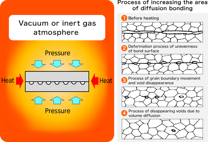 Trong lĩnh vực nghiên cứu vật liệu, quá trình liên kết khuếch tán ở trạng thái rắn thường được chia thành hai giai đoạn.Bước 1:Trong quá trình thứ 2Mặc dù phức tạp, phương pháp này cũng mang lại nhiều ưu điểm thực tế như:- Một quy trình tạo ra mối liên kết với chất lượng vô cùng cao. Liên kết này không có bất kỳ sự gián đoạn nào trong cấu trúc luyện kim, và hoàn toàn tránh được hiện tượng bề mặt xốp. Khi quan sát, phần mối liên kết có vẻ đồng đều, giống như một thể kim loại đồng nhất.