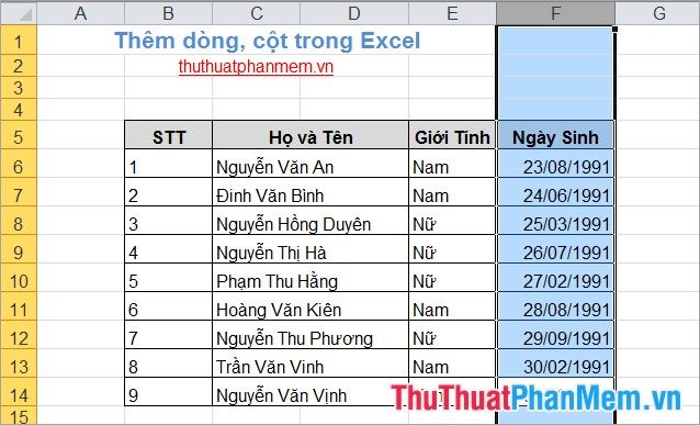 - Toàn bộ Cột: thêm cột mới.