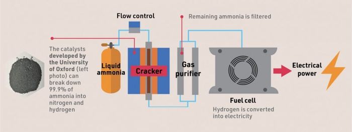 Hhe process of converting ammonia to electrical power.Amôn được lưu trữ trong một bình dạng lỏng của nó. Nó đi qua một 'cracker', phân giải thành nitơ và hydro bằng xúc tác được phát triển bởi Đại học Oxford.