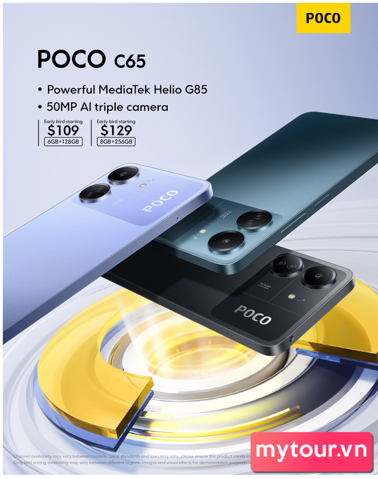 Theo xác nhận từ POCO, POCO C65 sẽ chính thức ra mắt vào ngày 5/11. Giá bán của chiếc điện thoại sẽ bắt đầu từ 109 USD cho bản RAM 6GB + bộ nhớ trong 128GB, trong khi phiên bản RAM 8GB + bộ nhớ trong 256GB có giá là 129 USD. Đáng tiếc, toàn bộ thông tin này đã được POCO tiết lộ trên mạng xã hội.