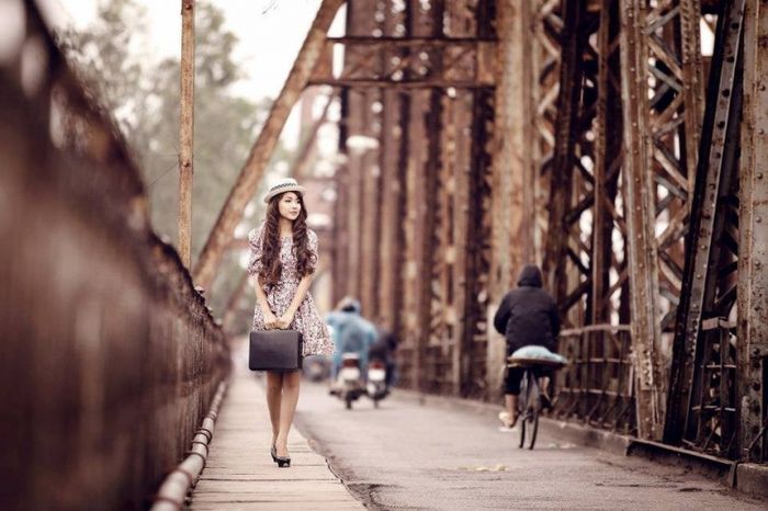 Không chỉ mang vẻ đẹp của thiết kế, cầu Long Biên là nguồn cảm hứng từ lịch sử dân tộc, là nơi ghi dấu những dòng thời gian không bao giờ phai mờ. Để có bức ảnh tết độc đáo với cây cầu lịch sử, bạn có thể mặc áo dài trắng thướt tha hoặc váy dài bay bổng. Còn nếu muốn sự phóng khoáng, áo phông và quần jean cũng là lựa chọn tuyệt vời.