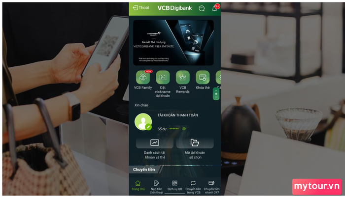 Bước 1: Đăng nhập vào tài khoản của bạn trên ứng dụng Vietcombank. Nếu bạn chưa có tài khoản, liên hệ với chi nhánh gần nhất để được hỗ trợ. Tiếp theo, chọn dịch vụ QR, ở thanh tùy chọn cuối cùng.