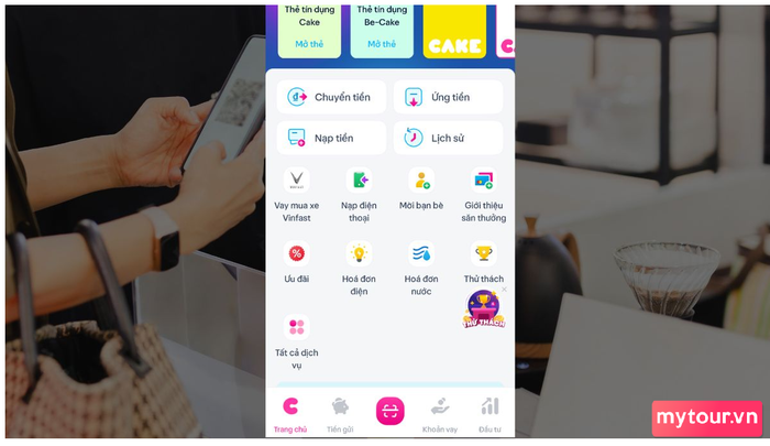 Bước 1: Đăng nhập vào ngân hàng số Cake của bạn. Trong giao diện chính, chọn biểu tượng mã QR ở phía dưới cùng.
