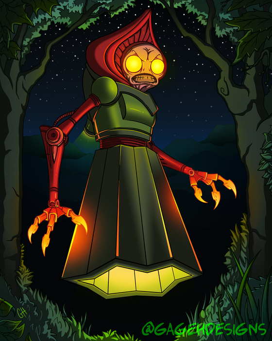 Từ bóng tối, họ nhìn thấy một sinh vật cao khoảng 4 mét, mặc một chiếc váy kim loại và có đầu hình tròn. Bàn tay của sinh vật bị vuốt và vặn vẹo.
