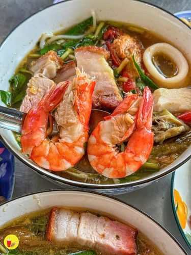 Một tô bún mắm đầy đặn, với hai con tôm to, ba đến bốn miếng heo quay, cùng với mực và chả cá. Topping nào cũng đều tươi ngon và chất lượng.