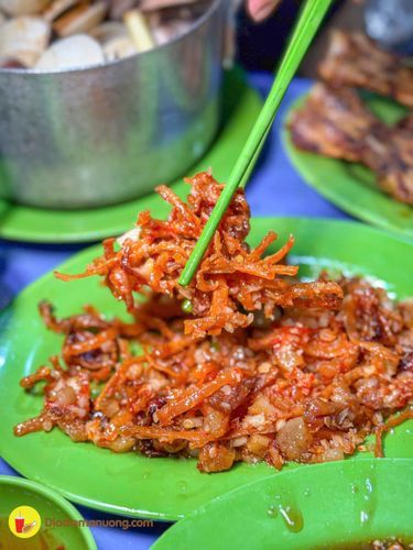 Món khiến bạn phải ghiền là khô mực chiên nước mắm giá 85k/con. Khô mực được chiên vàng giòn, xào với bơ tỏi và thêm chút tốp mỡ nữa. Khô mực mằn ngọt và béo ngon lắm.