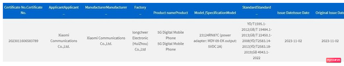 Hôm Nay, Phiên Bản 5G Của Redmi 13C Đã Xuất Hiện Trên Chứng Nhận 3C Với Mã Model 23124RN87C và Sạc Nhanh 10W Sử Dụng Củ Sạc MDY-09-EK.