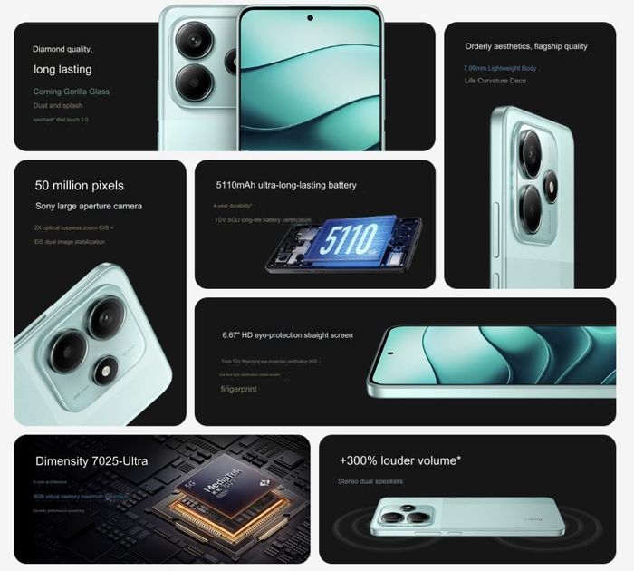 Sự cải tiến đáng chú ý nhất của Redmi Note 14 so với thế hệ trước nằm ở cụm camera. Thay vì cụm 3 camera như trước, Redmi Note 14 giờ đây được trang bị camera kép, với camera chính 50MP sử dụng cảm biến Sony LYT-600 khẩu độ f1.7, kèm theo camera phụ 2MP f2.4 và đèn Flash LED được thiết kế giống như một cảm biến thứ ba. Camera trước là cảm biến 16MP với thiết kế đục lỗ, tương tự như phiên bản trước.