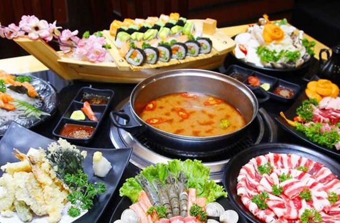Furthermore, the food quality here is also highly rated. The restaurant's menu is diverse with creative and meticulously prepared dishes. The hotpot buffet with perfect flavors. Diners can choose between miso or spicy hotpot according to their preferences. The traditional Japanese hotpot flavor combined with American beef, pork, various vegetables, and mushrooms will give you a delicious meal.