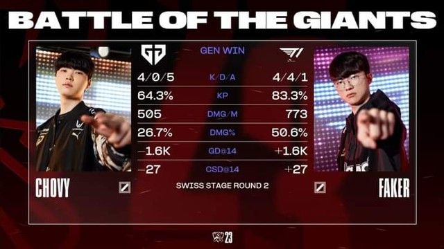 Faker vượt trội về mọi chỉ số so với Chovy từ đội Gen.G, mặc dù sử dụng vị tướng có ít tác dụng hơn.