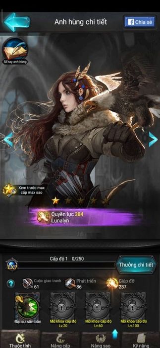 Anh hùng có 3 cấp Tím (yếu), Cam (trung), Vàng (mạnh). Hỗ trợ giảm thời gian, gia tăng sản lượng và sức mạnh cho binh chủng tùy theo kỹ năng.