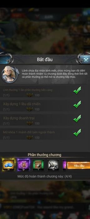 Rise of the Kings có hệ thống nhiệm vụ đa dạng và hấp dẫn. Các nhiệm vụ càng cao cấp, càng khó nhưng vật phẩm nhận được cũng phong phú hơn. Mỗi nhiệm vụ tương đương một chương khác biệt. Nhiệm vụ ngày đề xuất mang đến phần thưởng hấp dẫn khi hoàn thành, bao gồm Lúa mì, Gỗ xẻ, Nước tri thức (tăng kinh nghiệm anh hùng) và vật phẩm giảm thời gian xây dựng.