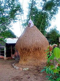 Trên các cánh đồng lúa sau khi thu hoạch, phần rơm được tập hợp và chất thành đống hoặc ụ để ủ. Những người làm nghề thu gom rơm thường được gọi là cây rơm, và họ sẽ dọn từng bó rơm khi cần. Hình ảnh một ụ rơm bên cạnh ngôi nhà tranh trên cánh đồng, nơi trẻ em chơi đùa quanh cây rơm, thường là biểu tượng của một làng quê yên bình.