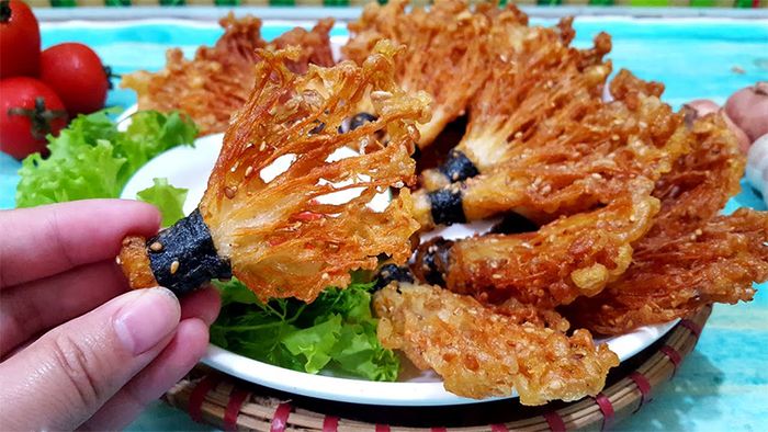 Khi bạn muốn một món chiên giòn tương tự khoai tây chiên, hãy thử rong biển cuộn nấm kim châm giòn tan. Món ăn có vị mặn, béo thơm ngon, chấm tương ớt càng hấp dẫn.