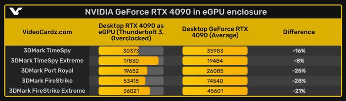 Hầu hết các box card đồ họa ngoại vi hiện nay vẫn phụ thuộc vào kết nối Thunderbolt 3/4 với băng thông 40 Gbps hạn chế. Do đó, hiệu suất của card đồ họa sẽ giảm đáng kể. Theo thử nghiệm của OmegaMalkior trên diễn đàn eGPU.io, RTX 4090 giảm từ 20 đến 25% hiệu suất khi sử dụng qua eGPU.