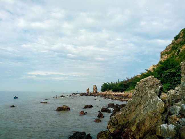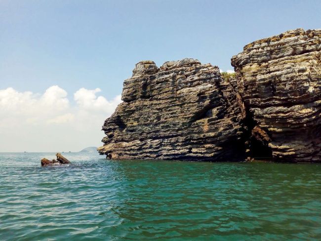 Nhìn từ biển, Mũi Trâu tạo nên một bức tranh hùng vĩ, với bãi biển nhỏ và những đá phong cách.