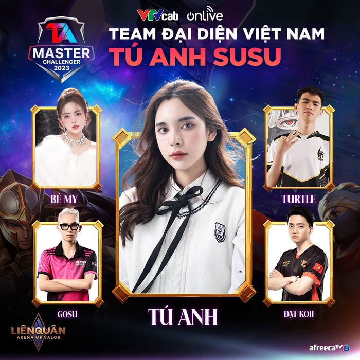 Tú Anh Susu (Nguyễn Tú Anh), sinh năm 1999, là một gương mặt quen thuộc với CV đa dạng, từ MC thể thao truyền thống đến các sự kiện Esports như Liên Quân, PUBG. Hiện cô được biết đến với nhiều vai trò như KOL, TikToker, MC Esports,... Với vai trò là đội trưởng nữ, Tú Anh Susu mong nhận được sự ủng hộ từ khán giả để đạt được thành tích cao nhất.
