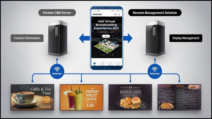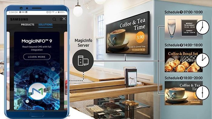 SAMSUNG Display Solutions sử dụng công cụ MagicInfo™ Server để quản lý nội dung trên các màn hình quảng cáo. Điều này giúp tạo ra sự liền lạc và thống nhất trong việc truyền đạt thông điệp về sản phẩm hoặc doanh nghiệp của bạn.