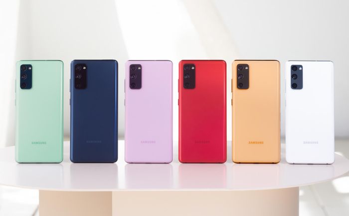 Galaxy S20 FE nổi bật với bộ sưu tập màu sắc độc đáo gồm 6 lựa chọn: đỏ, cam tím, xanh lá, xanh navy và trắng. Mặt sau của máy có bề mặt nhám giúp chống bám mồ hôi và dấu vân tay.