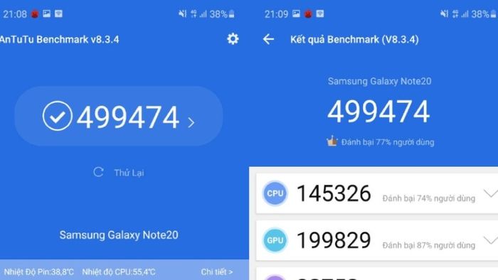 Samsung Note 20 được trang bị con chip Exynos 990 8 nhân, mang lại hiệu năng vượt trội và tốc độ xử lý mạnh mẽ. Điểm AnTuTu gần 500.000 điểm giúp điện thoại chơi mọi tựa game, kể cả các game nặng với đồ họa cao một cách mượt mà.