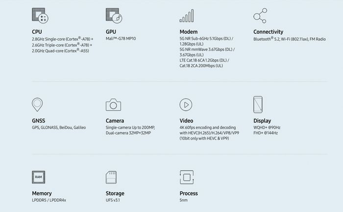Exynos 1080 được sản xuất trên công nghệ 5nm, giúp tăng hiệu suất và giảm tiêu thụ điện năng. Chip này có 8 nhân, với hiệu suất vượt trội so với các đối thủ trên thị trường. GPU Mali-G78 MP10 trên Exynos 1080 cũng cho hiệu suất gấp đôi so với thế hệ trước. Chip cũng hỗ trợ Wi-Fi 6, Bluetooth 5.2 và 5G với tốc độ tải xuống lên đến 5.1Gbps. Dự kiến, các điện thoại sử dụng Exynos 1080 sẽ ra mắt vào đầu năm 2021.