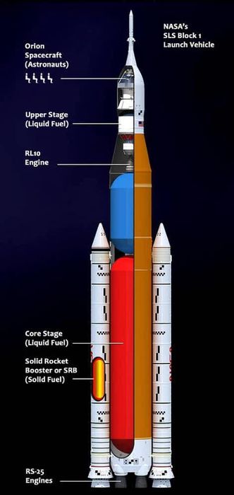 Phiên bản đầu tiên của SLS, được gọi là Block 1, cao 98 mét - thấp hơn tên lửa Saturn V với chiều cao khổng lồ 110 mét.