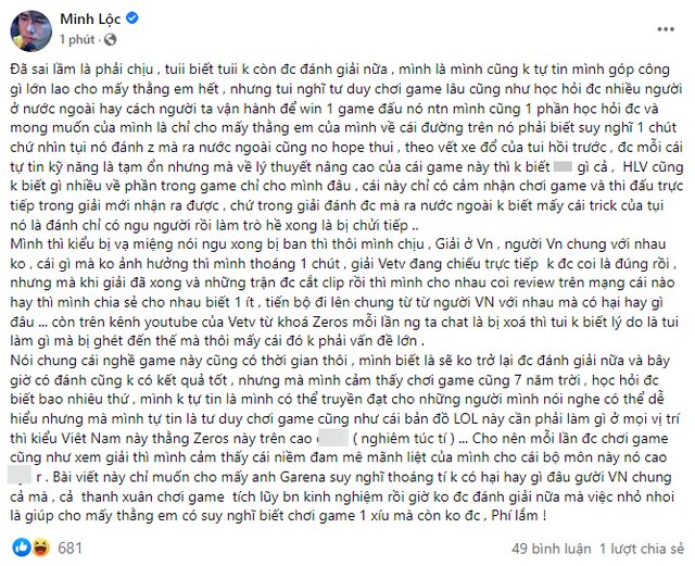 Dù án phạt về lời lẽ vẫn đang hiệu lực, Zeros có lẽ đang hối tiếc với quyết định của mình. Thời gian để tái xuất trong làng LMHT chuyên nghiệp dường như còn rất xa. Trong những khoảnh khắc như vậy, Zeros có lẽ là người hối tiếc nhất, nhưng chắc chắn anh ta cũng nhận ra rằng, đã là quá muộn để sửa sai.