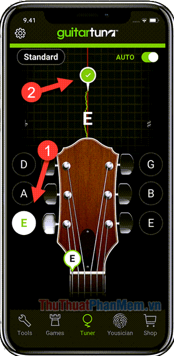 How can I use an app to tune my guitar strings effectively?