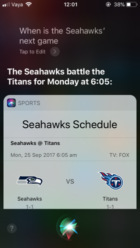 Siri hiển thị ngày thi đấu tiếp theo của đội bóng bầu dục Seattle Seahawks theo yêu cầu của người dùng, trên một chiếc iPhone SE chạy iOS 11 | |