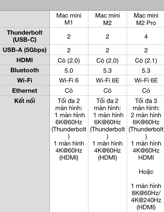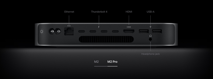 Mac mini M1 và M2 sẽ được trang bị 2 cổng Thunderbolt và 2 cổng USB-A (5Gbps), trong khi Mac mini M2 Pro sẽ có 4 cổng Thunderbolt 4 và 2 cổng USB-A (5Gbps). Ngoài ra, cả Mac mini M2 và M2 Pro đều hỗ trợ Wi-Fi 6E, trong khi Mac mini M1 chỉ hỗ trợ Wi-Fi 6. Cả hai phiên bản M2 và M2 Pro cũng sẽ hỗ trợ Bluetooth 5.3.