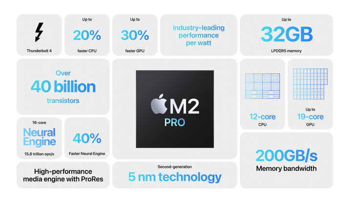Apple M2 có tối đa 8 nhân CPU nhưng sẽ có đến 10 nhân GPU, 16 nhân NPU, hỗ trợ RAM tối đa 24GB và SSD tối đa 2TB. Apple M2 Pro sẽ có tối đa 12 nhân CPU và 19 nhân GPU, hỗ trợ RAM tối đa 32GB và SSD tối đa 8TB, nhân NPU cũng là 16.Cổng kết nối