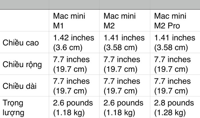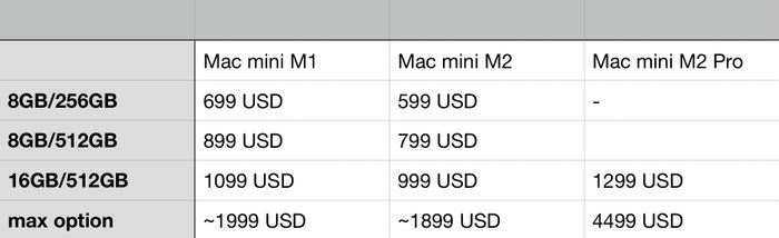 Mac mini M2 sẽ có mức giá bắt đầu từ 599 USD cho phiên bản cơ bản nhất và Mac mini M2 Pro sẽ có mức giá khởi điểm từ 1299 USD cho phiên bản cơ bản nhất. Thông tin chi tiết có thể được tìm thấy trong bảng dưới đây: