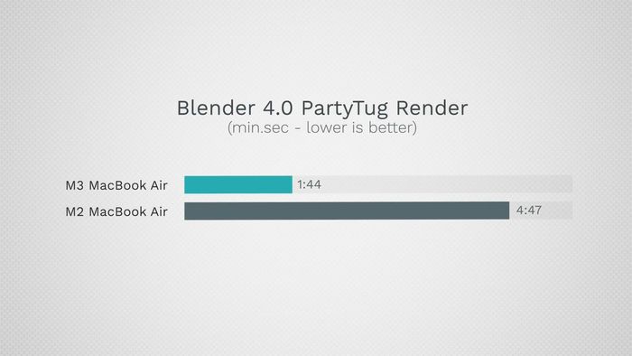 So sánh thời gian render vật thể 3D trên Blender 4.0 giữa MacBook Air M3 và M2. Nguồn: Max Tech.- Final Cut (thời gian render video 4K HEIC):
