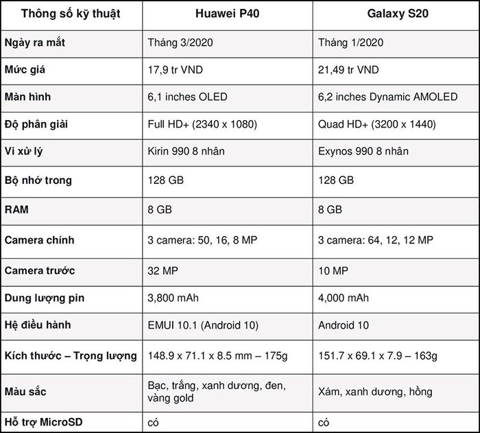 Pin của Galaxy S20 có dung lượng lớn là 4.000 mAh so với 3.800 mAh trên P40.