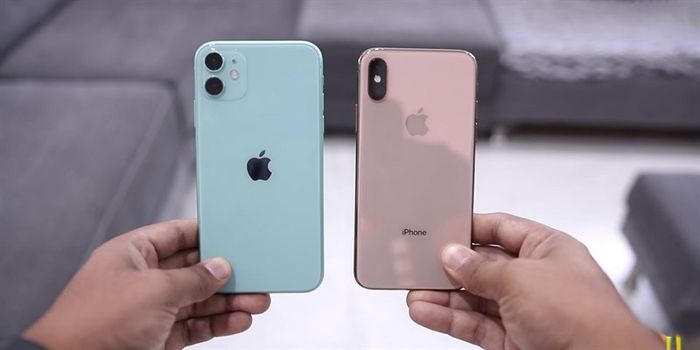 So sánh về ngoại hình giữa iPhone 11 (bên trái) và iPhone Xs (bên phải). Nguồn: Tecworkz.Khi so sánh giữa iPhone Xs và iPhone 11, sự khác biệt rõ nhất là ở thiết kế. Khi cầm trên tay, bạn sẽ dễ dàng nhận thấy đôi điểm đặc biệt: viền màn hình của iPhone 11 dày hơn so với iPhone Xs và khung bao xung quanh máy được chế tác từ hai chất liệu khác nhau.