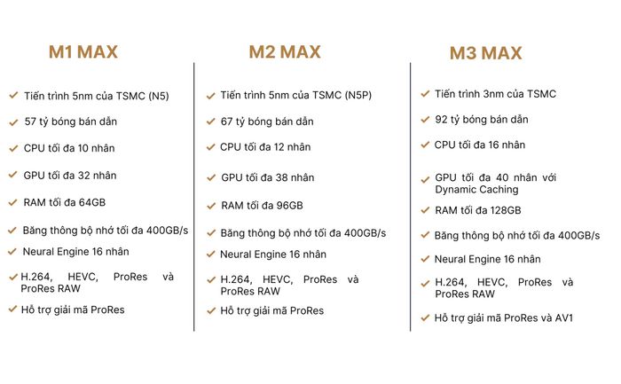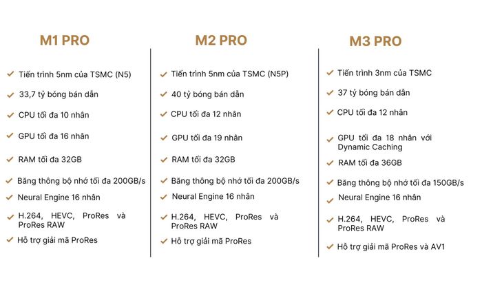 Sáng nay, Apple đã chính thức ra mắt dòng chip M3 series trong sự kiện trực tuyến “Nhanh Như Ác Quỷ”. Chip mới hứa hẹn với hiệu suất cao với số lượng bóng bán dẫn nhiều hơn, tốc độ CPU và GPU nhanh hơn. Điều đặc biệt là đây là dòng SoC đầu tiên của Apple hỗ trợ ray-tracing từ phần cứng và được bổ sung thêm GPU Dynamic Caching - công nghệ giúp GPU tự động quản lý bộ nhớ theo thời gian thực, tùy thuộc vào nhiệm vụ của người dùng.So sánh nhanh các thông số kỹ thuật của cả 3 đời chip Apple Silicon để anh em tham khảo dễ dàng.